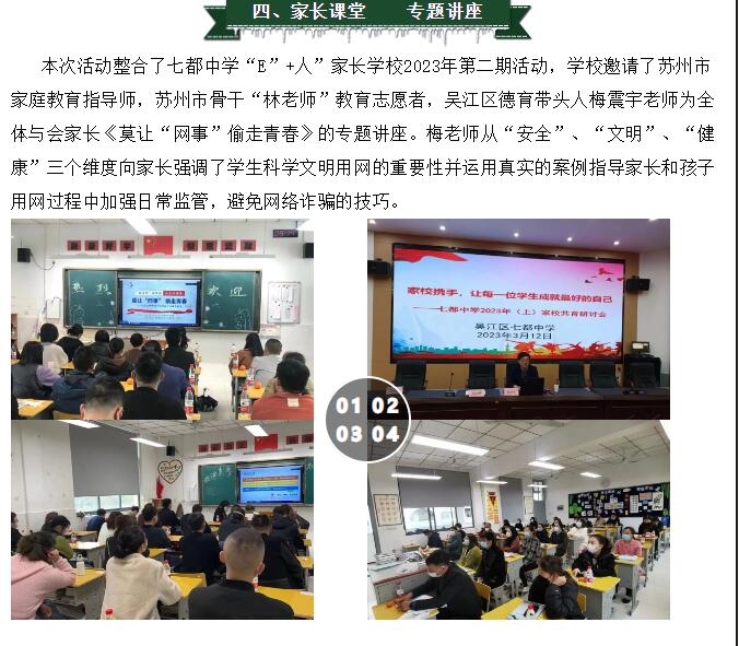 3月12日,七都中学举行家校共育研讨会暨“E+人”家长学校2023年(第二期)活动,七都中学全体任课教师和学生家长参加了本次活动。