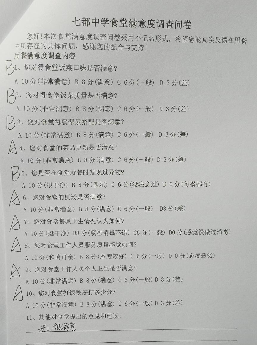为了得到更好的餐饮服务,改善食堂质量,提高学生就餐满意度,特制作了《七都中学食堂满意度调查问卷》,该调查问卷发放问卷415份,共回收问卷415份,回收率100%,有效率100%,以下对该调查问卷进行分析: